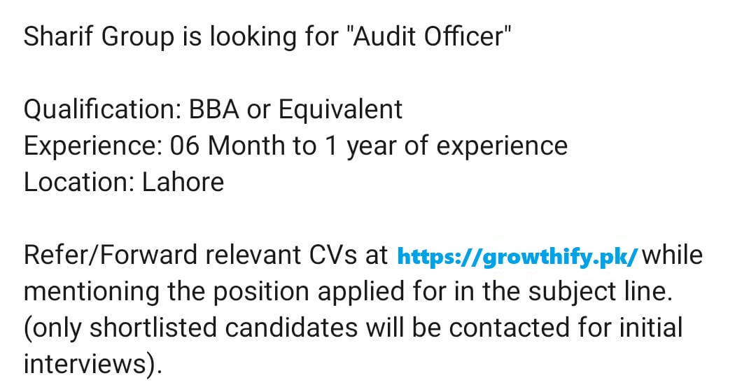 Sharif Group is seeking a detail-oriented and motivated Audit Officer to join their team in the Audit Department in Lahore, Punjab.